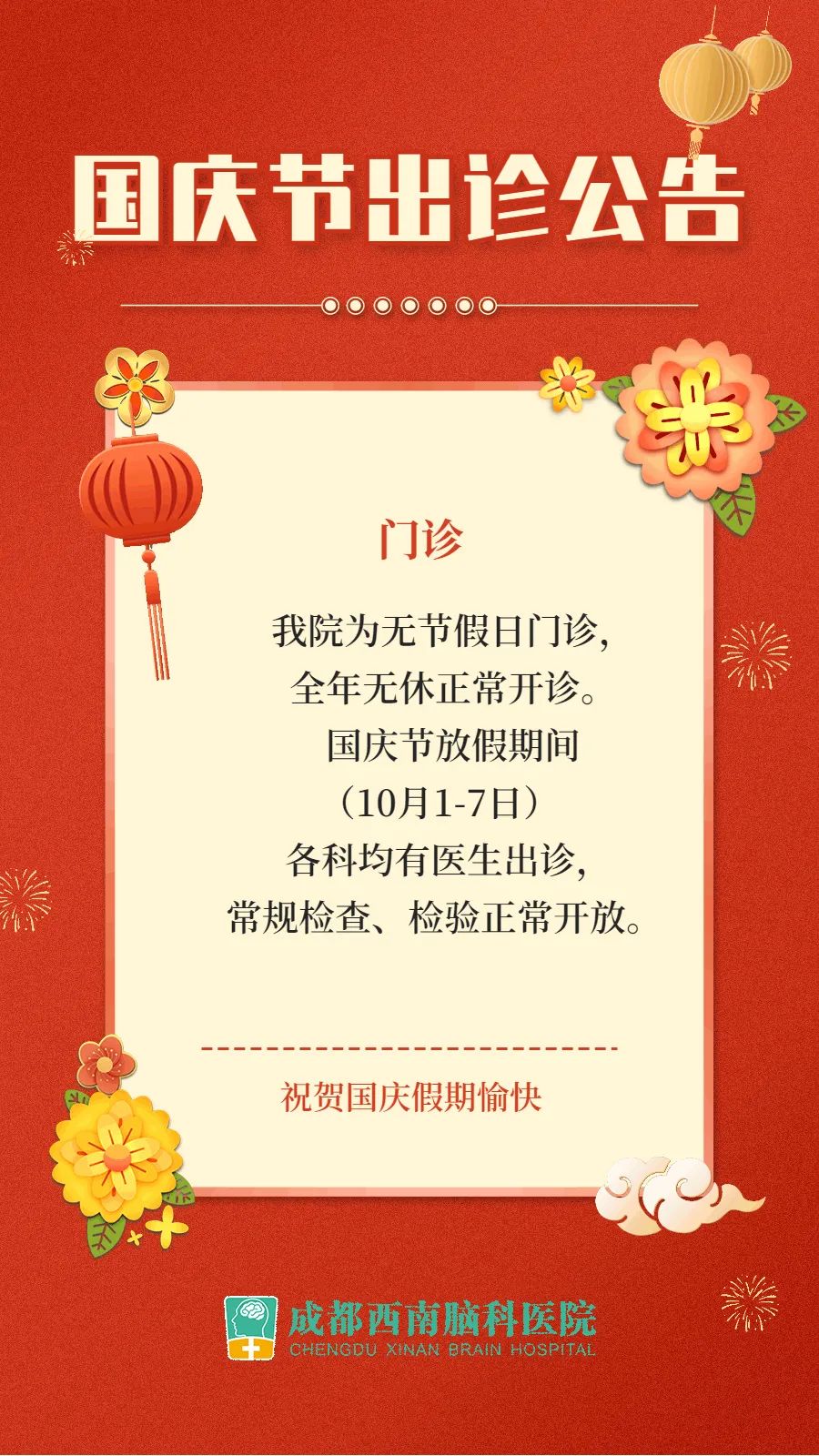为更大程度服务于百姓生活,根据医疗工作中患者假日“看病难、看病贵,看更难”的现实状况。成都西南脑科医院党支部通过会议决定:国庆期间正常接诊。